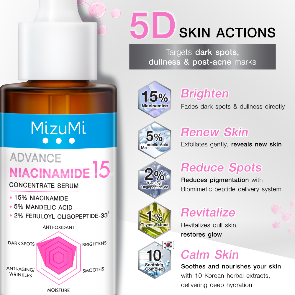 MizuMi Advance Niacinamide 15 Concentrate Serum 30 ml A highly concentrated 15% Niacinamide serum Reduces dark spots, dullness, redness, and deeply set blemishes Each bottle contains: 15% Niacinamide (Vitamin B3, maximum concentration) - Diminishes dullness and promotes a brighter, more radiant complexion 5% Mandelic Acid (a gentle type of AHA) - Exfoliates skin, helps fade dark spots, redness, and blemishes 2% Feruloyl Oligopeptide-33 - An innovative new peptide that targets and reduces pigmentation effectively 1% Thyme Extract - Revitalizes skin, leaving it clearer, smoother, and more radiant 10 Soothing Complex (antioxidants) - A blend of 10 herbal plant extracts from Korea - Soothes skin while providing deep hydration