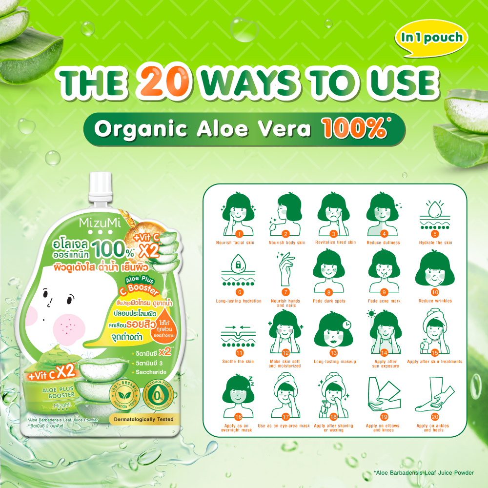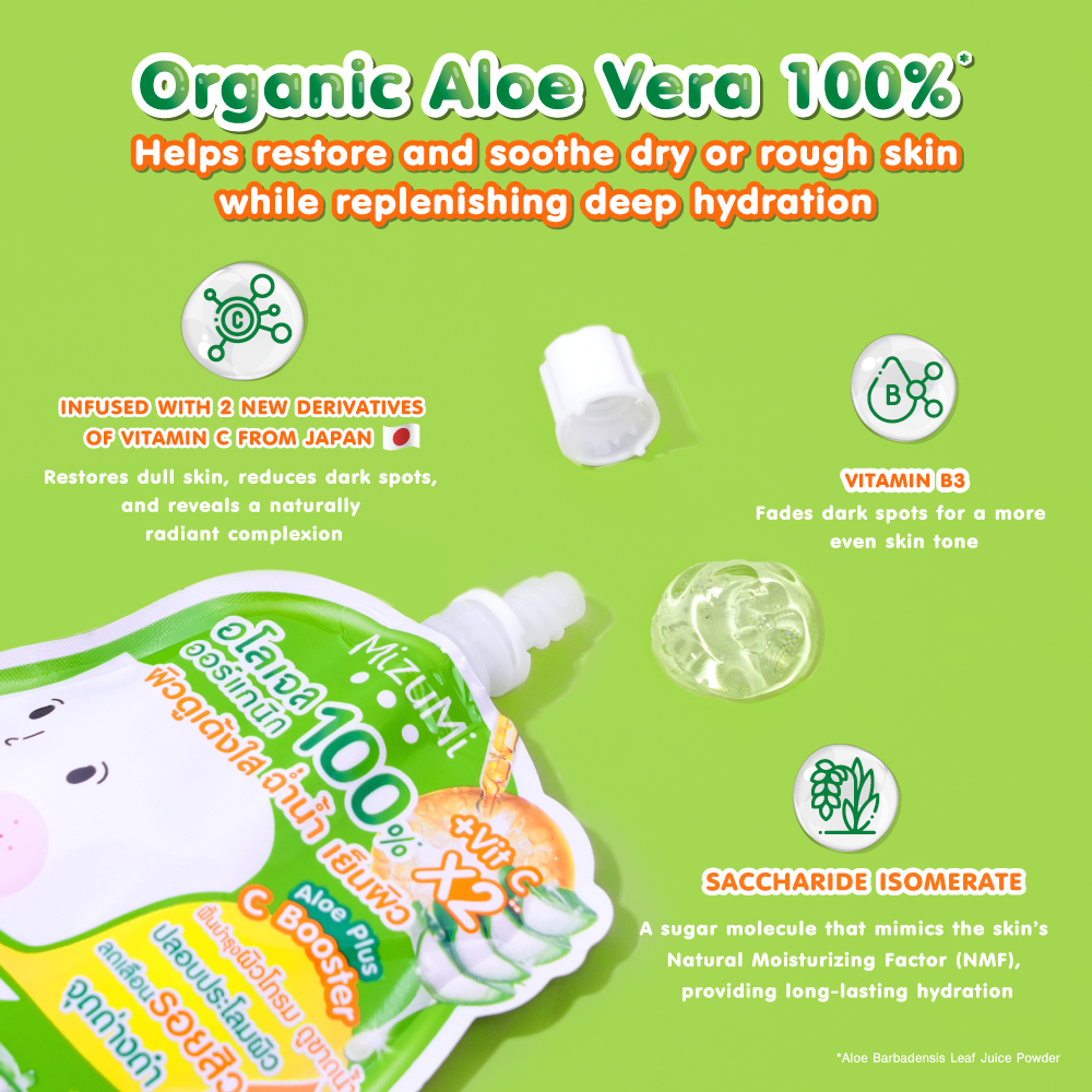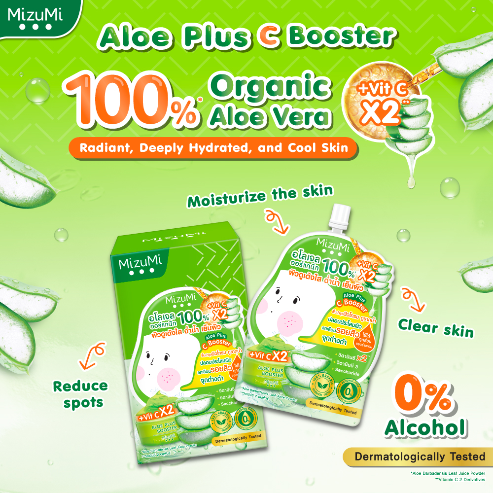 MizuMi Aloe plus C Booster (50g x 6 sachets) ✔️ 100% Organic Aloe Vera Gel — lightweight texture, fast-absorbing ✔️ Leaves skin looking plump, radiant, hydrated, and refreshed ✔️ Enriched with 2 Vitamin C derivatives: 2-O-Glyceryl-3-O-Octyl Ascorbate – a new, highly stable Vitamin C derivative from Japan that helps brighten dull skin. 3-Lauryl Glyceryl Ascorbate – strengthens the skin barrier and restores healthy-looking skin. ???? Soothes and nourishes dry, rough skin, leaving it soft and smooth ???? Provides long-lasting hydration ???? Revives dull skin for a naturally brighter complexion ???? Niacinamide (Vitamin B3): reduces dark spots and evens skin tone ???? Saccharide Isomerate: delivers deep and lasting moisture ✔️ 0% Alcohol