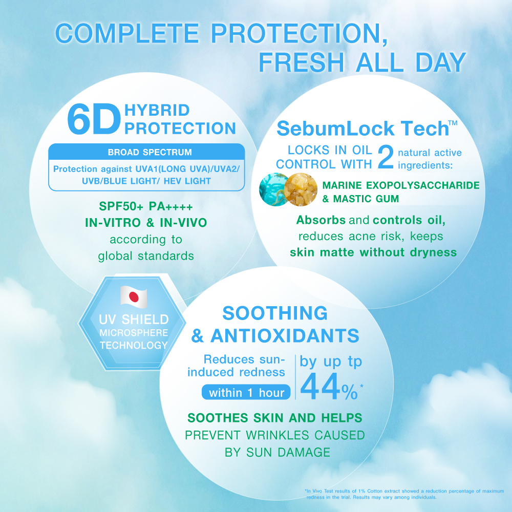16-hour oil control sunscreen* — keeps skin matte, lightweight, and shine-free all day.