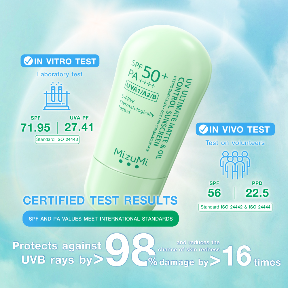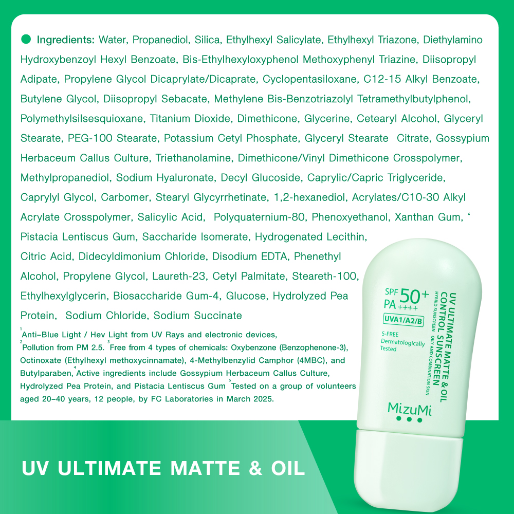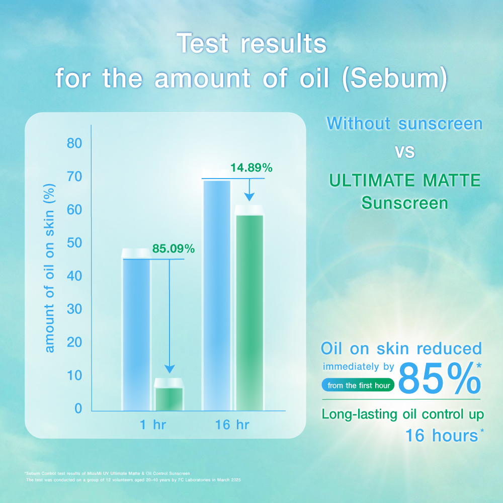 * Based on Sebum Control Test of MizuMi UV Ultimate Matte & Oil Control Sunscreen, conducted on 12 volunteers aged 20–40 by FC Laboratories, March 2025.