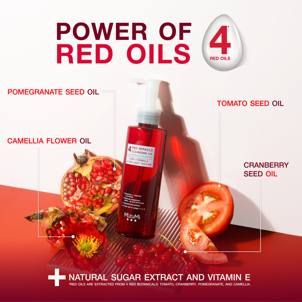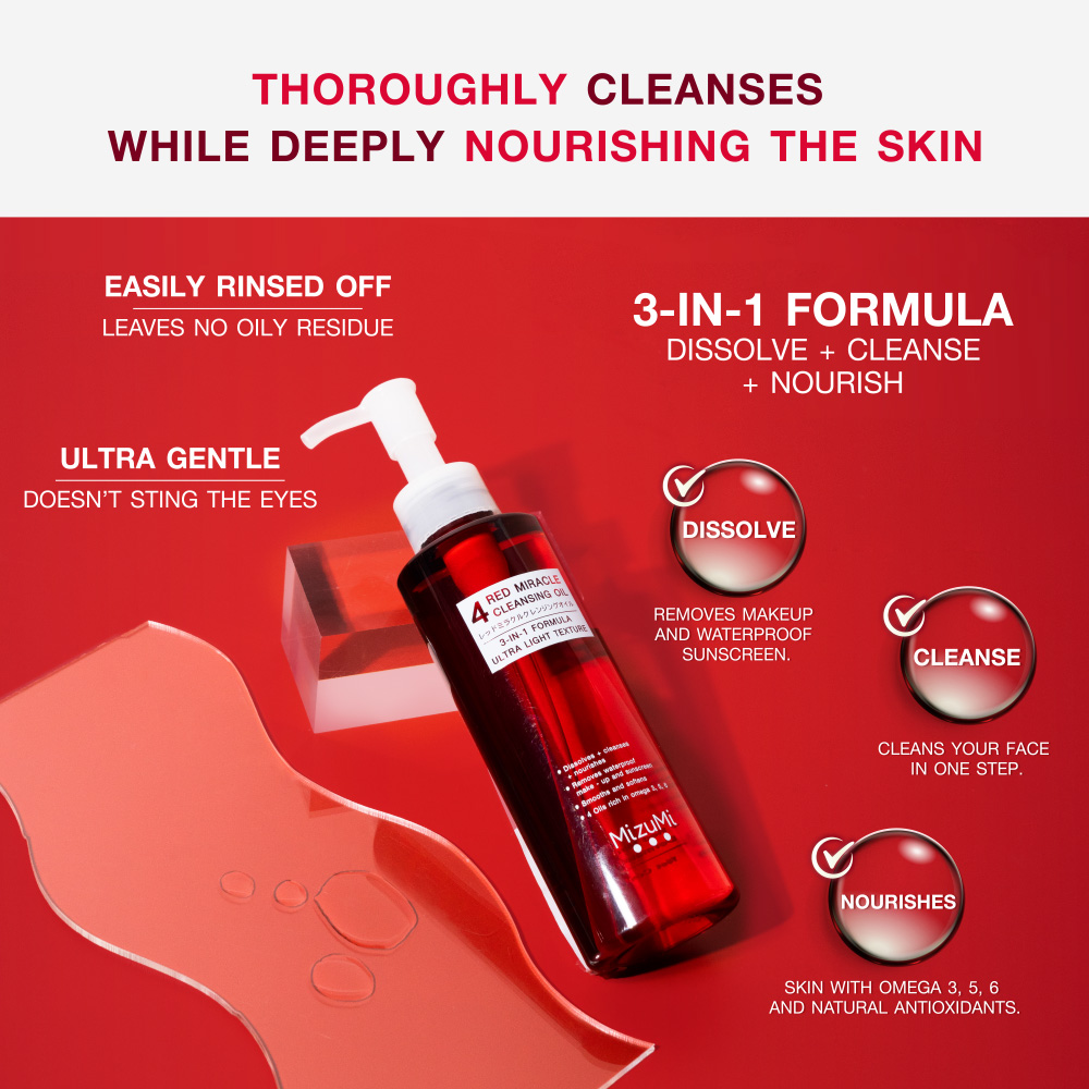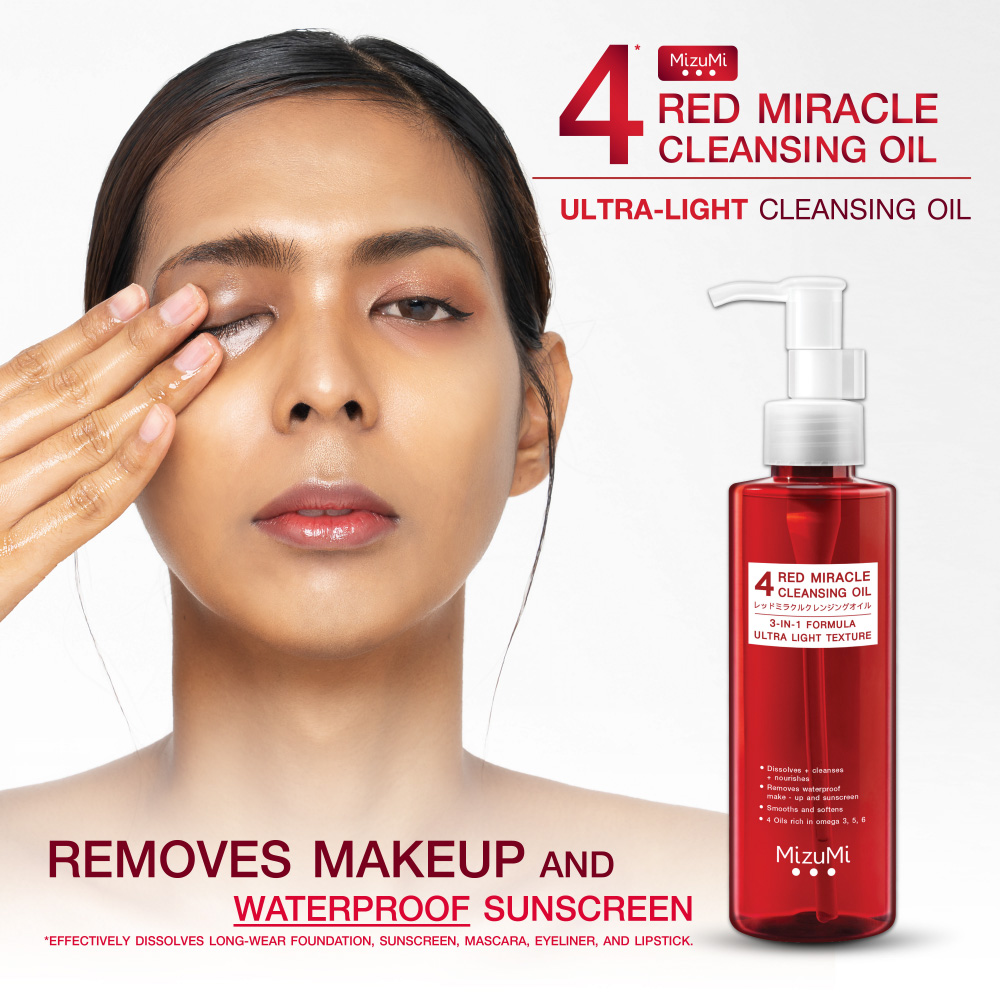 MizuMi 4 Red Miracle Cleansing Oil 150ml Ultra-lightweight oil with a 3-IN-1 formula: ️Dissolve + Cleanse + Nourish Effectively removes even waterproof sunscreen and makeup • Vitamin E – Antioxidant-rich and skin-repairing, helps protect against premature aging • Easily rinsed off, leaving no greasy or sticky residue • Infused with a calming aroma for a soothing cleansing experience