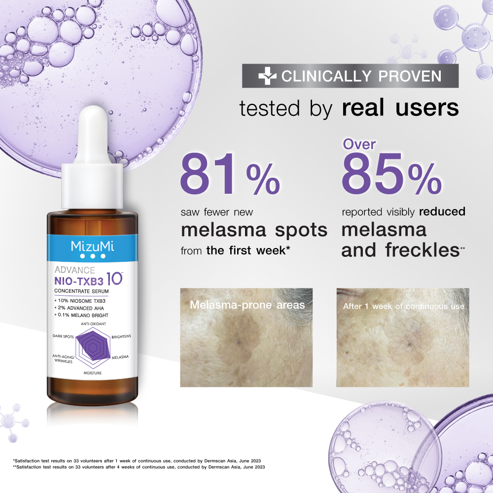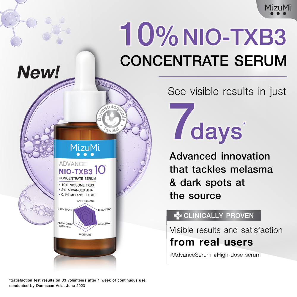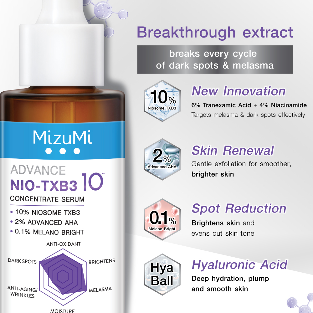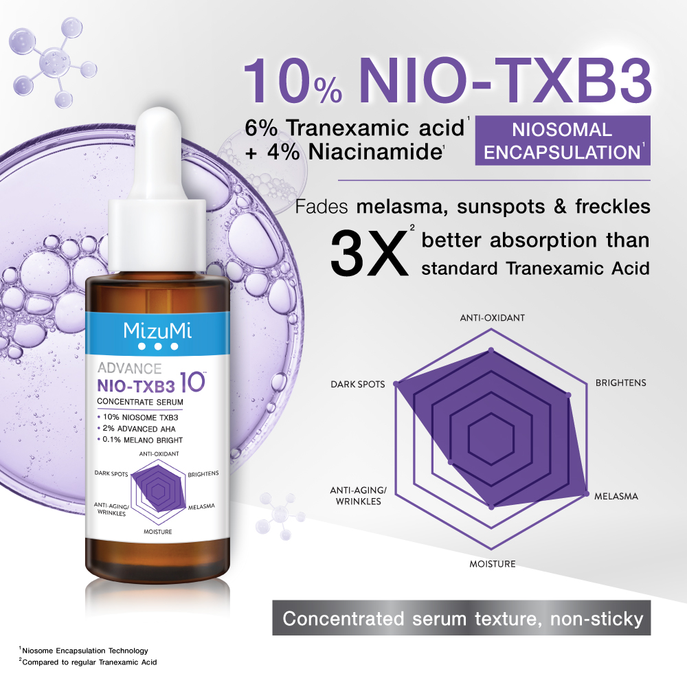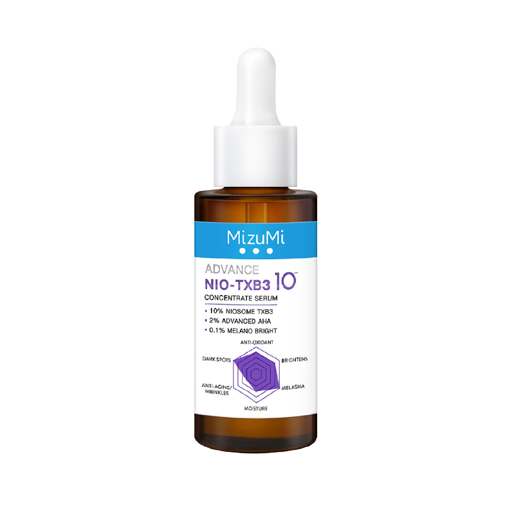 MizuMi Advance Nio-TXB3 Concentrate Serum 30 ml A concentrated 10% NIO-TXB3 serum Targets and reduces stubborn melasma and sun-induced dark spots — 3X more effective absorption than regular Tranexamic Acid* Each bottle contains: 10% Niosome TXB3 - 6% Tranexamic Acid + 4% Niacinamide encapsulated in niosome technology - Delivers active ingredients directly into the skin to effectively diminish melasma 2% Advanced AHA - Gently exfoliates for smoother, softer, and brighter-looking skin 0.1% Melano Bright - Helps prevent dark spot formation - Promotes a more even and radiant complexion Hya Ball (next-generation Hyaluronic Acid) - Deeply hydrates, replenishes, and smooths the skin How to Use: Apply morning and evening as part of your skincare routine.