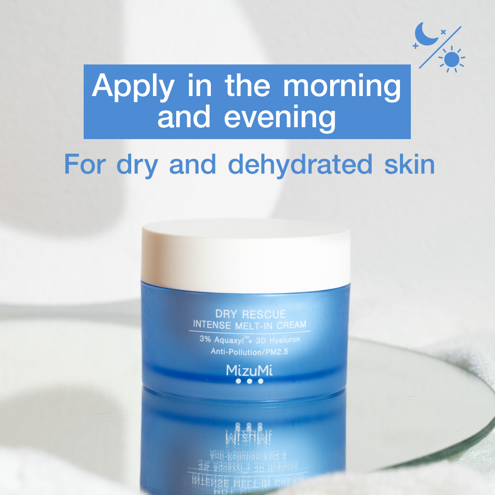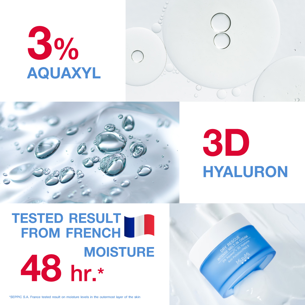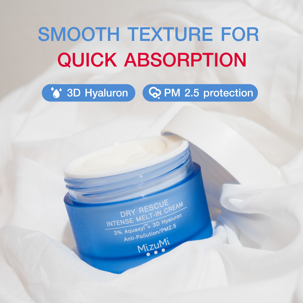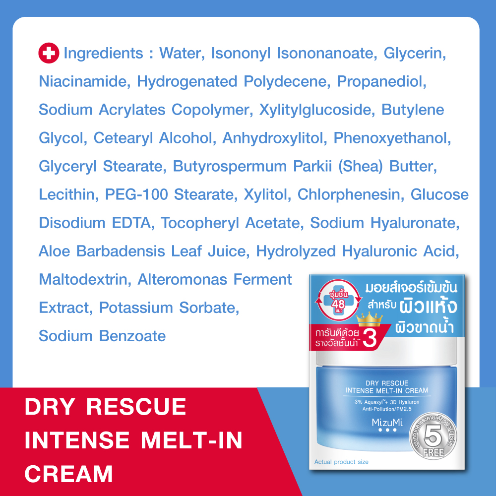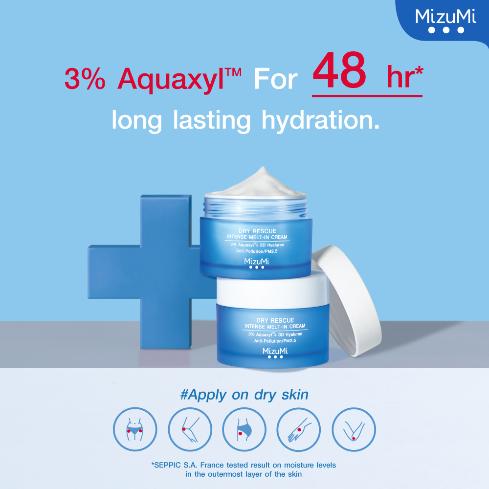 MizuMi Dry Rescue Intense Melt-In Cream 45ml A concentrated moisturizer that delivers 48-hour hydration* ✔️ Specially formulated for dry, dehydrated skin in need of intensive care ✔️ Restores and nourishes dry areas from face to body — 5 key dry zones ✔️ Soft, non-sticky cream texture that melts seamlessly into skin upon application (Melt-In Cream) Key Ingredients ???? 3% Aquaxyl • Natural Sugar Complex with 3 types of sugars that instantly boost hydration • Prevents moisture loss and locks in hydration for up to 48 hours* • Helps reduce the appearance of fine lines caused by dryness ???? 3D Hyaluron (3 molecular sizes of Hyaluronic Acid) • Enhances skin’s ability to retain moisture • Reduces dryness and irritation while strengthening skin for a healthier look ???? Bio-P Exopolysaccharide (natural microbial extract) • Protects skin against environmental stressors and PM2.5 pollution *Based on hydration retention testing.
