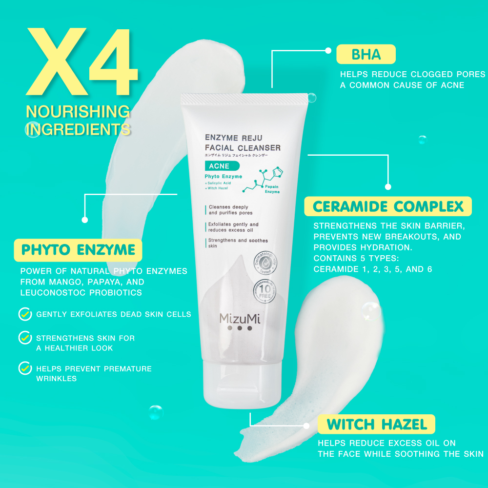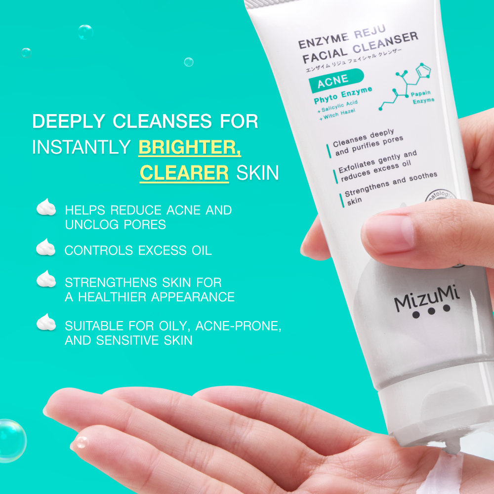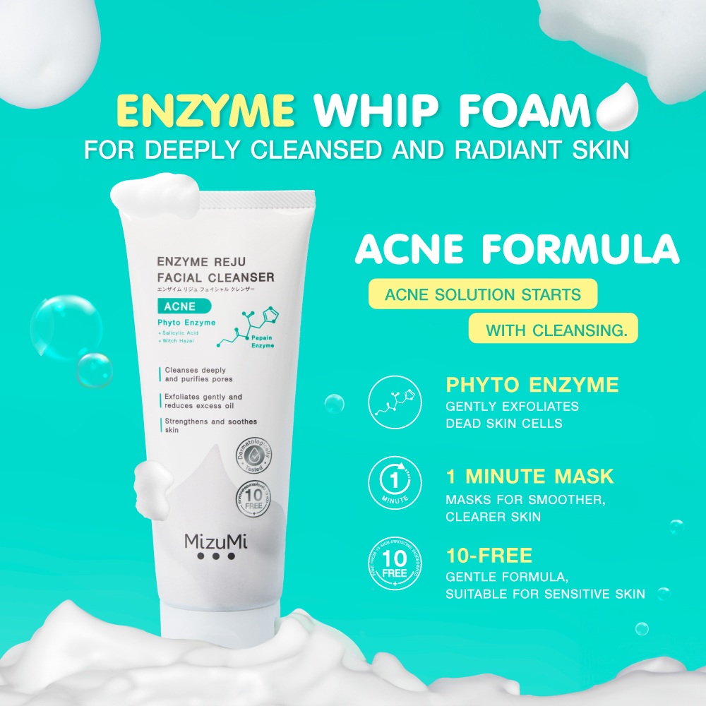 MizuMi Enzyme Reju Facial Cleanser Acne 100 ml ???? Soft whipped foam that helps reduce clogged pores and excess oil. ???? Suitable for acne-prone and sensitive skin. ✔️ Salicylic Acid • BHA that helps reduce pore-clogging, one of the main causes of acne. ✔️ Witch Hazel • Helps control excess oil and soothe the skin. ✔️ Ceramide Complex • Contains 5 types of ceramides to keep the skin soft and hydrated for a long time.