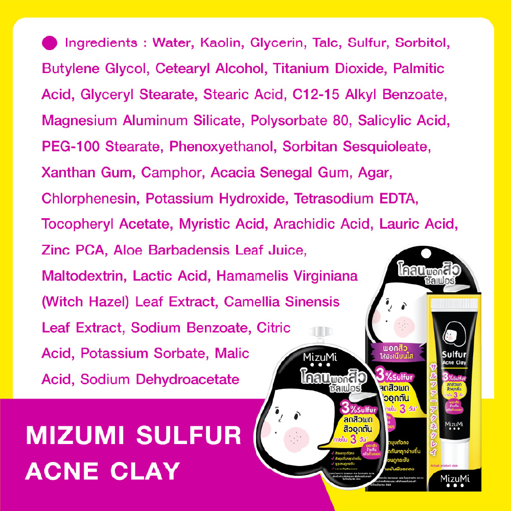 Water ,Kaolin ,Glycerin ,Talc ,Sulfur ,Sorbitol ,Butylene Glycol ,Cetearyl Alcohol ,Titanium Dioxide ,Palmitic Acid ,Glyceryl Stearate ,Stearic Acid ,C12-15 Alkyl Benzoate ,Magnesium Aluminum Silicate ,Polysorbate 80 ,Salicylic Acid ,PEG-100 Stearate ,Phenoxyethanol ,Sorbitan Sesquioleate ,Xanthan Gum ,Camphor ,Acacia Senegal Gum ,Agar ,Chlorphenesin ,Potassium Hydroxide ,Tetrasodium EDTA ,Tocopheryl Acetate ,Myristic Acid ,Arachidic Acid ,Lauric Acid ,Zinc PCA ,Aloe Barbadensis Leaf Juice ,Maltodextrin ,Lactic Acid ,Hamamelis Virginiana (Witch Hazel) Leaf Extract ,Camellia Sinensis Leaf Extract ,Sodium Benzoate ,Citric Acid ,Potassium Sorbate ,Malic Acid ,Sodium Dehydroacetate