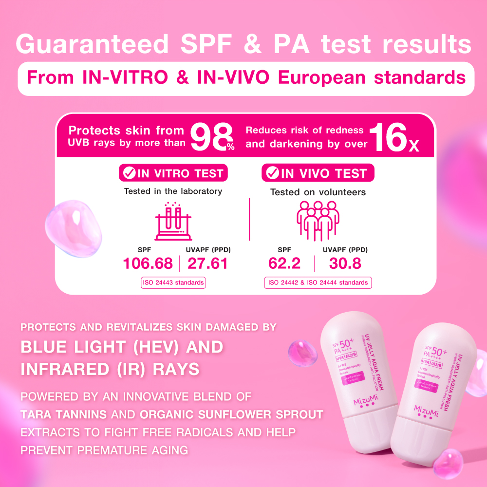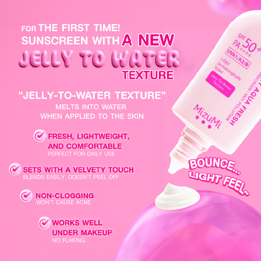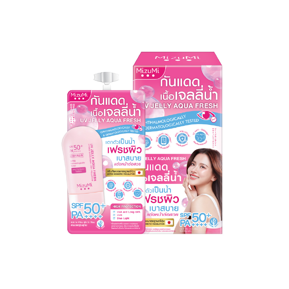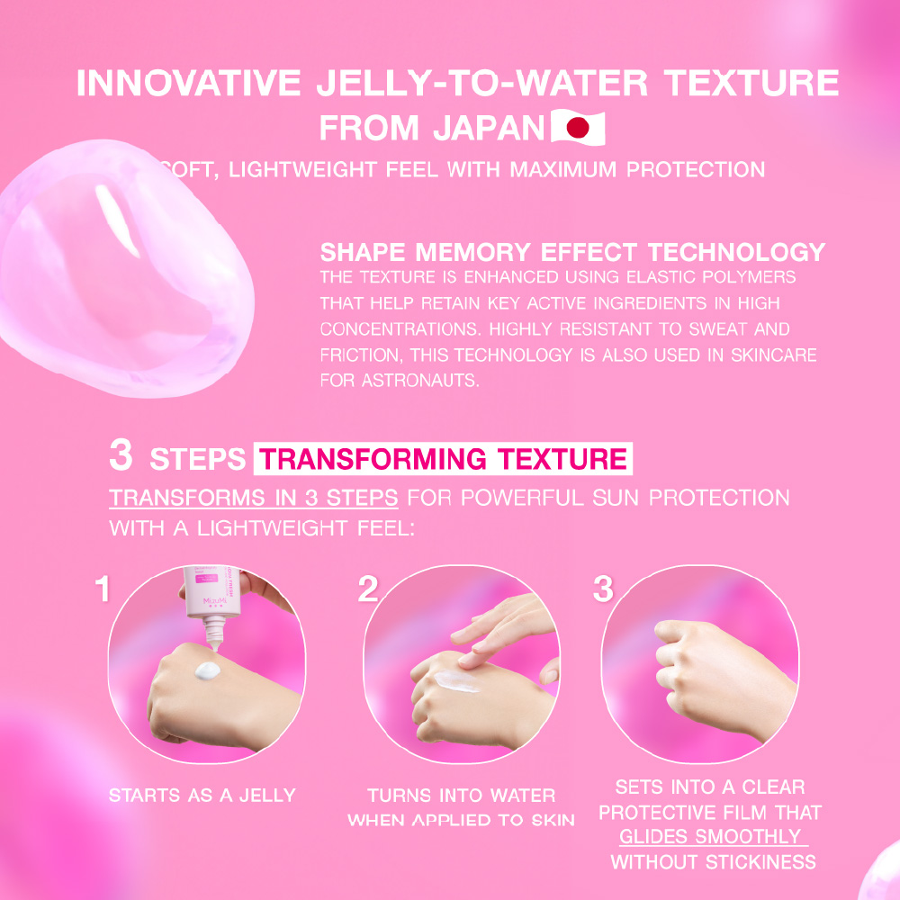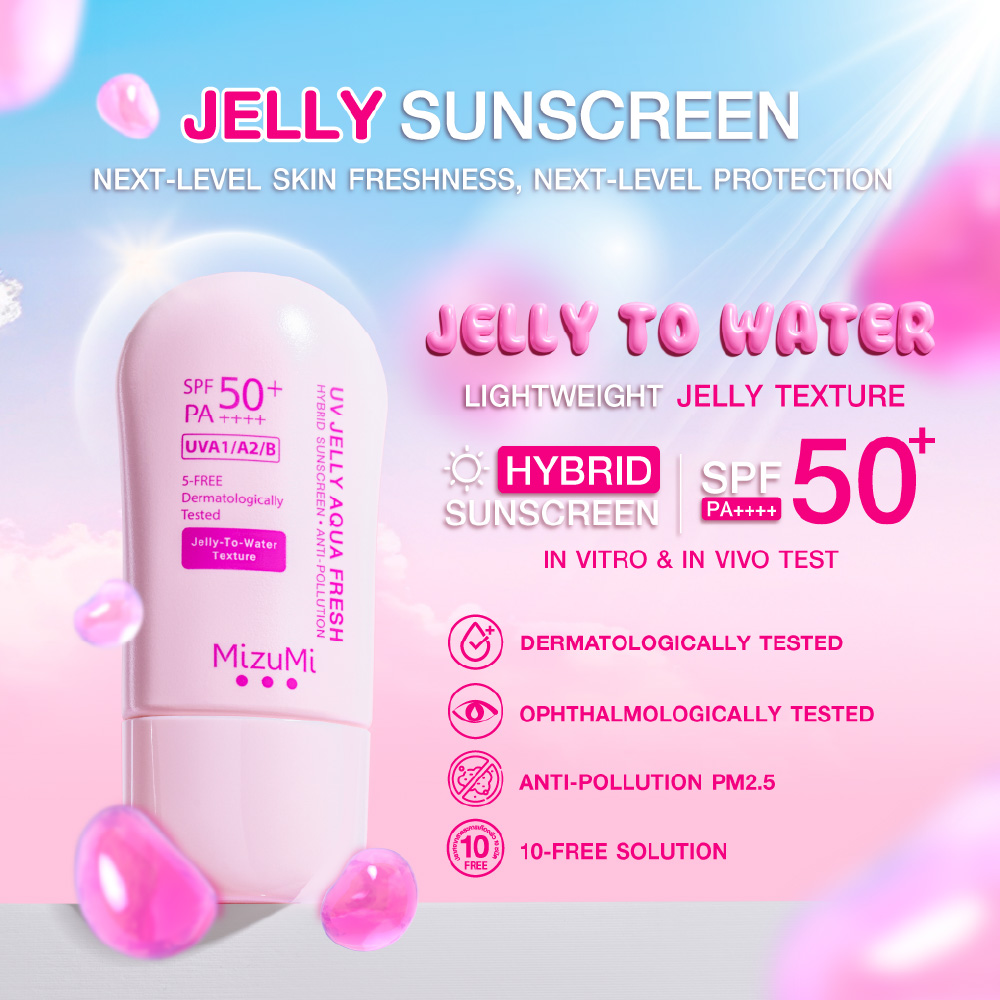 Aqua-fresh jelly sunscreen with a water-light texture that glides on easily – the ultimate innovation in skin protection. • Tested under both In-Vitro & In-Vivo methods according to international standards • Powered by Japanese Silk Microcapsule Technology & Dermatologically Tested – Tested for skin irritation by dermatologists • Ophthalmologically Tested – Tested for eye irritation by ophthalmologists • CORAL SAFE – Free from 4 reef-harming chemical UV filtersBenefits: • UV Protection – Shields skin from UVA / Long UVA / UVB • Anti-Pollution – Helps reduce sensitivity caused by pollution and PM 2.5 • Anti-Blue Light / HEV Light – Protects against blue light and screen exposure • Anti-Oxidant & Anti-Aging – Defends against free radicals and premature aging • SPF50+ PA++++ • Encapsulates sunscreen agents in tiny capsules • Enhances even distribution and arrangement of sunscreen on the skin • Improves stability and long-lasting protection ️ New “Jelly Aqua” Texture ???? Transforms from jelly to water upon application ???? Dries quickly with a velvety, non-greasy finish ???? Makeup-ready immediately after use